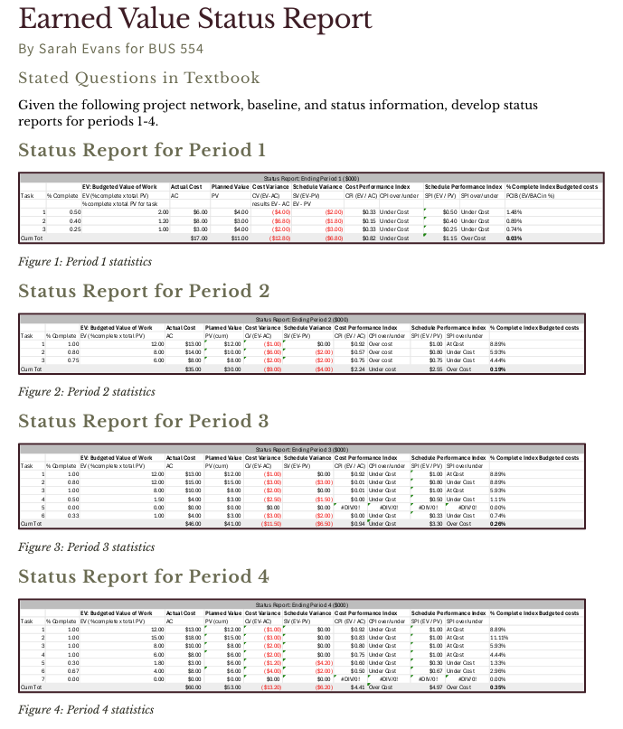 Below is an example of an Earned Value Status report submitted showing status reports, cost variance calculations, cost performance index and percent complete index budgeted costs.