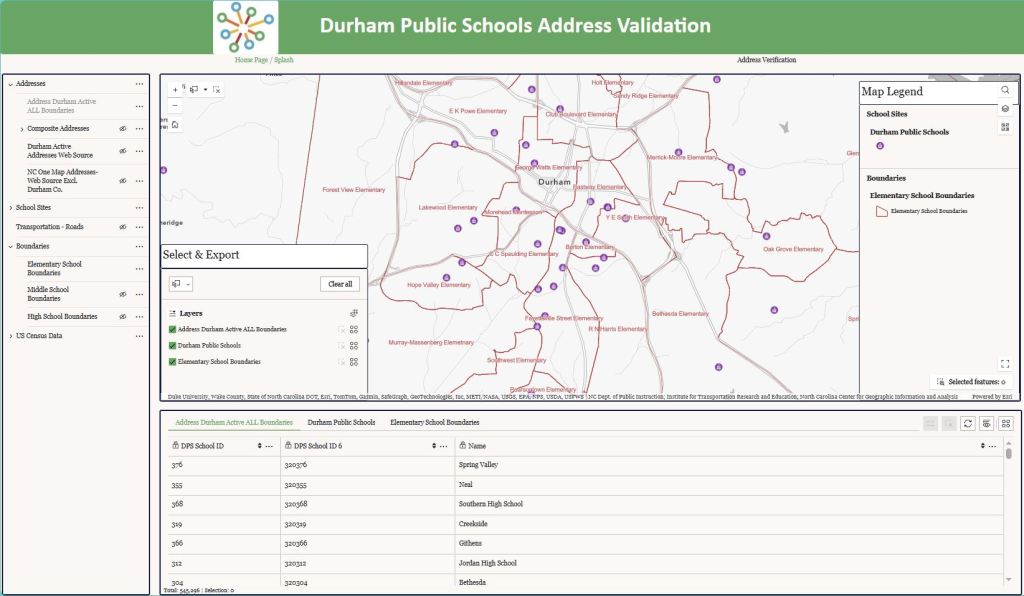 Design a process to spatially join Durham County Open Data Active Addresses into DPS school boundaries. This is needed to create and constrain new student registrations so users can select addresses from a drop down, rather than typing in their own address.