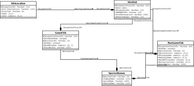 First, I reviewed the data and determined what the relational keys would be. Then I mapped the relationships, shown in the image below, and used that model as the basis for the database design.